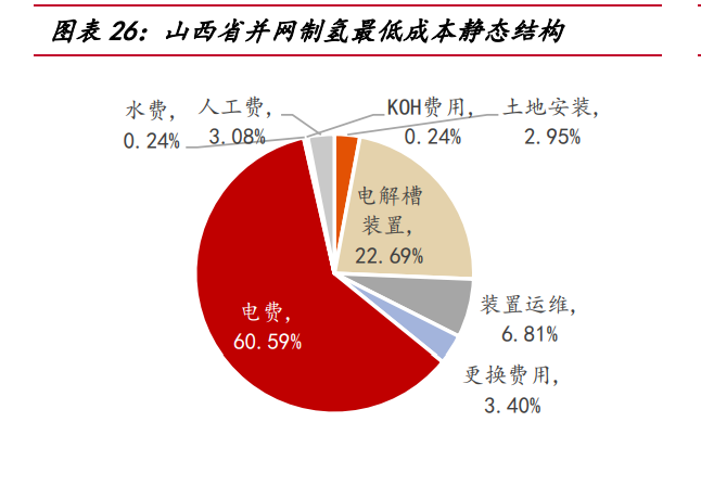 山西省經(jīng)濟(jì)利用小時數(shù)為 1915 小時,并網(wǎng)制氫單位成本最低:截止 2022Q3,山 西省風(fēng)電光伏裝機(jī)量占比位列全國第 14,但由于負(fù)荷較少,山西省低電價小時數(shù)在 五個省份中較為顯著, 0~0.05 元/kWh 共計 1341 小時,0.3~0.35 元/kWh 共計 1219 小時,低電價優(yōu)勢明顯。經(jīng)過我們的測算,當(dāng)利用小時數(shù)為 1915 小時,綜合電價 0. 1868 元/kWh,山西制氫成本最低為 15.2 元/kg,考慮氧氣售后沖減費(fèi)用,制氫成本 下降至 9.6 元/kg。山西省并網(wǎng)制氫成本結(jié)構(gòu)中,因現(xiàn)貨市場低電價優(yōu)勢顯著,電費(fèi) 占比相對較低,僅 60.59%,電費(fèi)之中,電能量價格占 42%,輸配容量價格占 36%。
