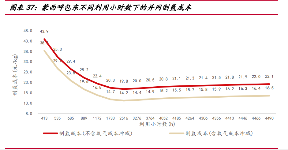 蒙西經(jīng)濟(jì)利用小時數(shù)為 2516 小時,成本有較大下降空間:蒙西低電價小時數(shù)相 對分散,-0.05~0 元/kWh 共計 408 小時,0.25~0.3 元/kWh 共計 561 小時,整體上并 網(wǎng)制氫成本劣于山西和甘肅省,但優(yōu)于山東和廣東省。當(dāng)利用小時數(shù)為 2516 小時, 綜合電價 0.308 元/kWh,蒙西并網(wǎng)制氫成本最低為 19.75 元/kg,考慮氧氣售后沖減 費(fèi)用,制氫成本下降至 14.15 元/kg。蒙西并網(wǎng)制氫成本結(jié)構(gòu)中,電費(fèi)占比 76.84%。 電費(fèi)之中,電能量價格占 71%,輸配容量價格占 14%??紤]到蒙西有豐富的風(fēng)光發(fā)電 資源,未來風(fēng)光發(fā)電滲透率提升空間較大,電價分布或?qū)⑦M(jìn)一步左偏,降低并網(wǎng)制氫 成本。