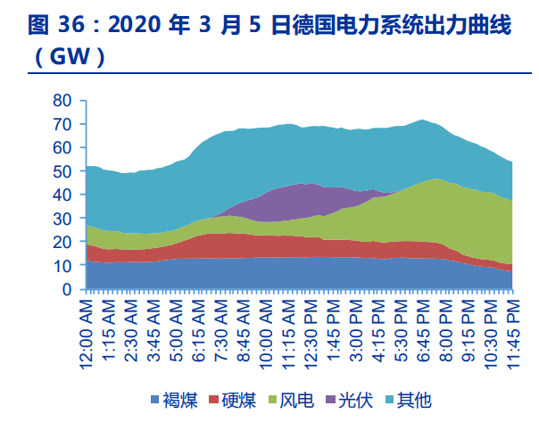 煤電是當(dāng)前潛力最大的靈活性資源之一。截止 2022 年底我國(guó)煤電裝機(jī)已突破 12 億千 瓦,后續(xù)仍將保持一定規(guī)模的建設(shè)。但我國(guó)煤電靈活性較差,純凝機(jī)組不經(jīng)過(guò)改造最低出 力一般只有額定容量的 50%左右,熱電聯(lián)產(chǎn)機(jī)組在供熱期則更差。如果通過(guò)改造將最低出 力降低至 25%則可以釋放出僅 5 億千瓦調(diào)節(jié)能力,大約相當(dāng)于 250GW 抽水蓄能,是現(xiàn)存 抽蓄調(diào)節(jié)能力的 5 倍。德國(guó) 2021 年煤電利用小時(shí)數(shù) 3664 小時(shí),其中硬煤 4980 小時(shí),褐 煤 2346 小時(shí),中國(guó) 2022 年利用小時(shí)數(shù)達(dá)到近 4700 小時(shí),仍有進(jìn)一步下降空間;(2) 以日內(nèi)波動(dòng)來(lái)看,德國(guó) 2020 年 3 月 5 日晚間風(fēng)電出力大幅增加,從午間約 7GW 大幅增 加至晚間超過(guò) 28GW,硬煤發(fā)電迅速?gòu)淖罡?10.7GW 調(diào)減至不足 3GW,日內(nèi)壓低負(fù)荷到 30%以下,為新能源消納做出巨大貢獻(xiàn)。