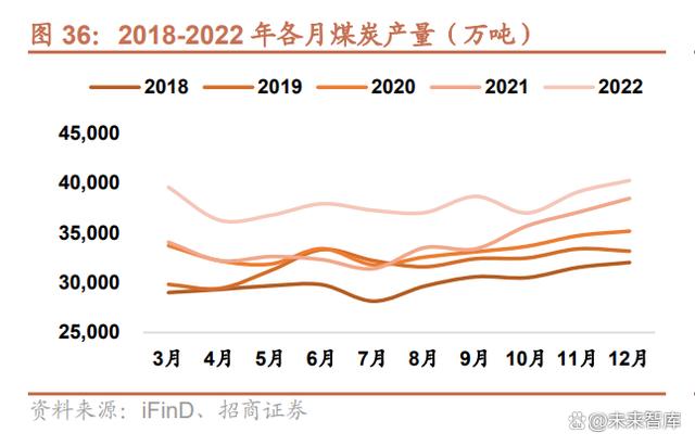 在保供政策的支持下,2022 年國內(nèi)煤炭供應(yīng)在進口煤炭價格暴漲的情況下基本維持穩(wěn)定。2022 年,全國煤炭產(chǎn)量 45.6 億噸,同比增長 10.6%,比去年增加 4.4 億噸,創(chuàng)歷史新高。2022 年各個月煤炭產(chǎn)量在近五年均為最高。進口 煤炭 2.93 億噸,同比增長 43.34%,其中 8-12 月份煤炭進口量遠高于往年同期水平。庫存方面,2022 年全國煤炭庫 存由 1 月的 1945 萬噸增長到年末的 2057 萬噸,增長 5.7%。港口庫存上,秦皇島港、黃驊港煤炭庫存 2022 年內(nèi)均 有上升,其中秦皇島港年內(nèi)最高庫存達到 592 萬噸,相較于年初增長 31.8%。內(nèi)陸省份上,東北、華東、西南、西北 煤炭庫存在年內(nèi)均有上漲,六大發(fā)電集團(國家電投、華能集團、國家能源集團、華電集團、大唐集團、三峽集團) 煤炭庫存在年末達到 1206.8 萬噸,較年初增長 3.8%。