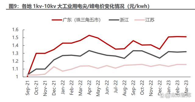 “分時(shí)電價(jià)”、“電力市場(chǎng)化”政策驅(qū)動(dòng),大工業(yè)平均用電價(jià)格提高。2021 年 下半年全國大部分省份陸續(xù)出臺(tái)分時(shí)電價(jià)政策,調(diào)整峰谷電價(jià)及峰谷時(shí)段,其中以 江蘇、廣東、浙江為例的經(jīng)濟(jì)發(fā)達(dá)省份率先、多次調(diào)整,峰谷價(jià)差有較大幅度的擴(kuò) 大,尖、峰時(shí)段也有不同程度的延長(zhǎng),大工業(yè)平均用電價(jià)格提高。