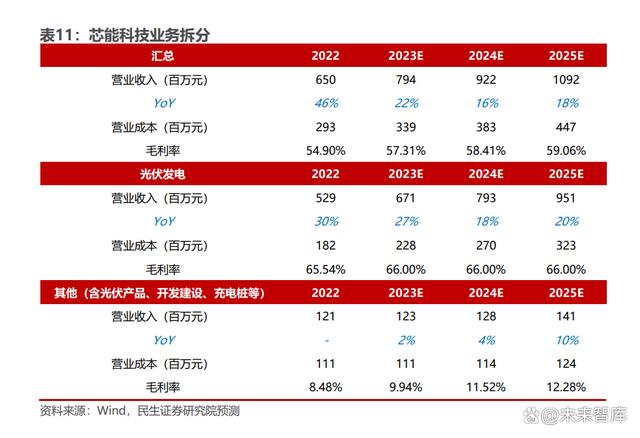 芯能科技業(yè)務(wù)拆分: 22 年業(yè)務(wù)結(jié)構(gòu)收入占比:光伏發(fā)電(81%)+光伏產(chǎn)品(12%)+開發(fā)建設(shè)(4%) +充電樁(1%)+其他業(yè)務(wù)(1%)。其中光伏產(chǎn)品、開發(fā)建設(shè)主要以配套光伏發(fā)電 業(yè)務(wù)為主。 光伏發(fā)電業(yè)務(wù):受益于大工業(yè)電價同比上調(diào)以及公司自持電站規(guī)模持續(xù)擴(kuò)大、光伏 發(fā)電量穩(wěn)步增加,同時,在分布式光伏整縣推進(jìn)背景下,EPC 及運(yùn)維服務(wù)業(yè)務(wù)的市 場空間進(jìn)一步打開,公司光伏發(fā)電業(yè)務(wù)穩(wěn)定增長。根據(jù)公司轉(zhuǎn)債問詢函回復(fù),未來 三年公司計劃以分布式光伏并網(wǎng)裝機(jī)容量不低于 15%的年化增長率持續(xù)擴(kuò)大自持分布式光伏電站建設(shè)投入,我們預(yù)計公司光伏發(fā)電業(yè)務(wù) 23-25 年收入增速分別為 27%/18%/20%。