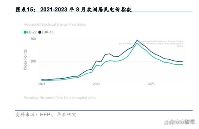當前電價已修復至 2021 年水平,德意英電價在 0.4 歐元/kWh 左右,戶儲仍具經濟性。2022 年 9 月后,歐洲開始對能源和電價進行調控,歐洲極端高電價有所改善,當前天然氣價格 與市場化交易電價均已恢復至 21 年水平。據 HEPI 報道,2023 年 8 月歐洲 27 國平均終端 電價為 0.2591 歐元/kWh,2022 年戶儲新增裝機量最多的三個國家(德國、意大利、英國) 電價分別為 0.38/0.39/0.43 歐元/kWh,安裝戶儲仍具有較高經濟性。