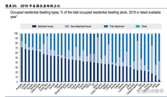 遠期空間:美國房屋結構具有天然優(yōu)勢,戶儲可利用屋頂面積高。戶用光伏和儲能設備通 常被安裝在家庭住房的屋頂上。因此,住房的類型、屋頂的面積大小等也直接決定了戶儲 的安裝難度和長期安裝需求,相對來說,獨立住房比高層樓房單戶房頂面積多,能夠安裝 更多戶儲,結構也更適合當前的分布式戶儲設備。根據 OECD,美國 2019 年獨立住房和半 獨立住房的占比接近 70%,在統(tǒng)計的多個國家中排行第 6 名。根據美國經濟分析局,2022 年美國人口 3.34 億,我們保守估計獨棟住房 6000 萬套,按 10%的滲透率、平均每戶 10kWh 計算,戶儲容量約為 600GWh,戶儲市場遠期想象空間大。