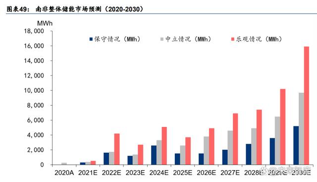 政策刺激疊加電力危機,南非戶儲市場增長預計有可持續(xù)性。為了緩解電力危機,南非政 府宣布 2023 與 2024 年全國電價將分別調漲 18.56%與 12.74%,以此來抑制居民用電需求。 從 23 年最新數據來看,23 年 1-7 月中國向南非出口逆變器累計 31.08 億元,同比+487.7%; 平均價格 2152.0 元/臺,同比 22 年 1-7 月+105.6%,中國出口南非逆變器價量雙升??紤] 到南非亦在跟隨全球腳步逐步擺脫煤炭發(fā)電依賴,燃煤電站大規(guī)模建設受阻,電力問題短 期無法解決,我們認為南非儲能市場的高增速具有較好的持續(xù)性。根據世界銀行預測, 2020-2030 年南非儲能電池裝機的年復合增速在 34%-50%之間,在悲觀/中性/樂觀場景假 設下,2030 年南非儲能電池裝機量將達到 5.2/9.7/15.9GWh。