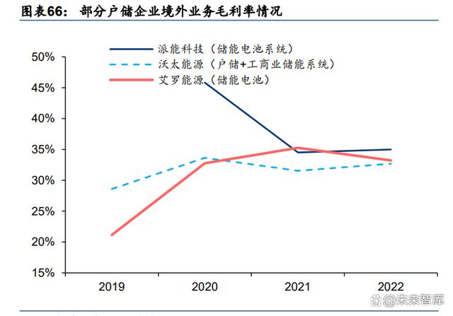 對比成熟的家電行業(yè):我們選取發(fā)展相對比較成熟的家電行業(yè)進行對比,家電企業(yè)做境外 業(yè)務主要有出口自有品牌、海外并購、ODM/OBM/OEM 代工三種模式。我們通過對比發(fā)現, 選擇自有品牌模式的樂歌股份、安克創(chuàng)新、石頭科技、星徽股份能夠在境外獲得更高的毛 利率,我們計算四家企業(yè) 2018-2022 年境外與境內的毛利率差值均值為 10.65pct。同時, 由于能夠選擇以自有品牌打海外市場的公司產品具有較強的產品力,其整體毛利率通常也 處于較高水平。戶儲產品在一定程度上具有家電屬性,國內儲能產業(yè)鏈發(fā)展國際領先,具 有強產品力與品牌力,隨著后續(xù)行業(yè)競爭加劇,我們認為穩(wěn)態(tài)下戶儲行業(yè)優(yōu)質企業(yè)仍能夠 維持高出國內市場平均 5 個百分點以上的毛利率水平。