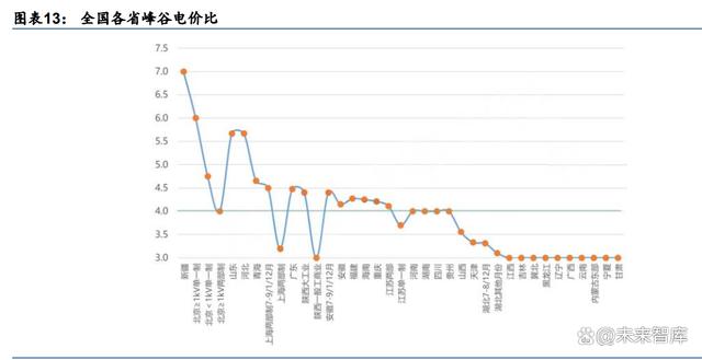 國家發(fā)改委推動(dòng)合理拉大峰谷電價(jià)差,引導(dǎo)電力用戶削峰填谷。2021 年 7 月,國家發(fā)改委 印發(fā)《關(guān)于進(jìn)一步完善分時(shí)電價(jià)機(jī)制的通知》,部署各地進(jìn)一步完善分時(shí)電價(jià)機(jī)制,合理拉 大峰谷電價(jià)價(jià)差,為引導(dǎo)電力用戶削峰填谷、促進(jìn)儲能加快發(fā)展釋放了清晰強(qiáng)烈的價(jià)格信 號:(1)優(yōu)化峰谷電價(jià)機(jī)制:積極優(yōu)化峰谷電價(jià)機(jī)制,科學(xué)劃分峰谷時(shí)段,合理確定峰谷 電價(jià)價(jià)差,系統(tǒng)峰谷差率超過 40%的地方,峰谷電價(jià)價(jià)差原則上不低于 4:1;其他地方原 則上不低于 3:1。(2)建立尖峰電價(jià)機(jī)制:在峰谷電價(jià)的基礎(chǔ)上推行尖峰電價(jià)機(jī)制,主要基 于系統(tǒng)最高負(fù)荷情況合理確定尖峰時(shí)段,尖峰電價(jià)在峰段電價(jià)基礎(chǔ)上上浮比例原則上不低 于 20%。可參照尖峰電價(jià)機(jī)制建立深谷電價(jià)機(jī)制。隨后,各省市分時(shí)電價(jià)政策步入快速完 善期,出臺相關(guān)政策調(diào)整峰谷時(shí)段劃分和電價(jià)浮動(dòng)比例。