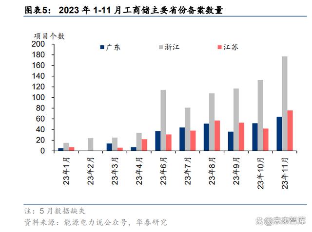 多因素推動(dòng),23 年高增趨勢初現(xiàn)。根據(jù)能源電力說公眾號的不完全統(tǒng)計(jì),僅 2023 年 7-11 月,國內(nèi)工商業(yè)儲能備案項(xiàng)目個(gè)數(shù)達(dá) 1305 個(gè)。從工商業(yè)分布較為集中的廣東、浙江、江蘇 三個(gè)省份來看,月度備案項(xiàng)目數(shù)量均呈現(xiàn)大幅上升趨勢。據(jù)不完全統(tǒng)計(jì),2023 年以來我國 工商業(yè)儲能備案規(guī)模已經(jīng)達(dá)到 3.46GW/9.26GWh。工商業(yè)儲能高速增長的勢頭已經(jīng)初步顯 現(xiàn),2023 年成為國內(nèi)工商儲的放量元年。